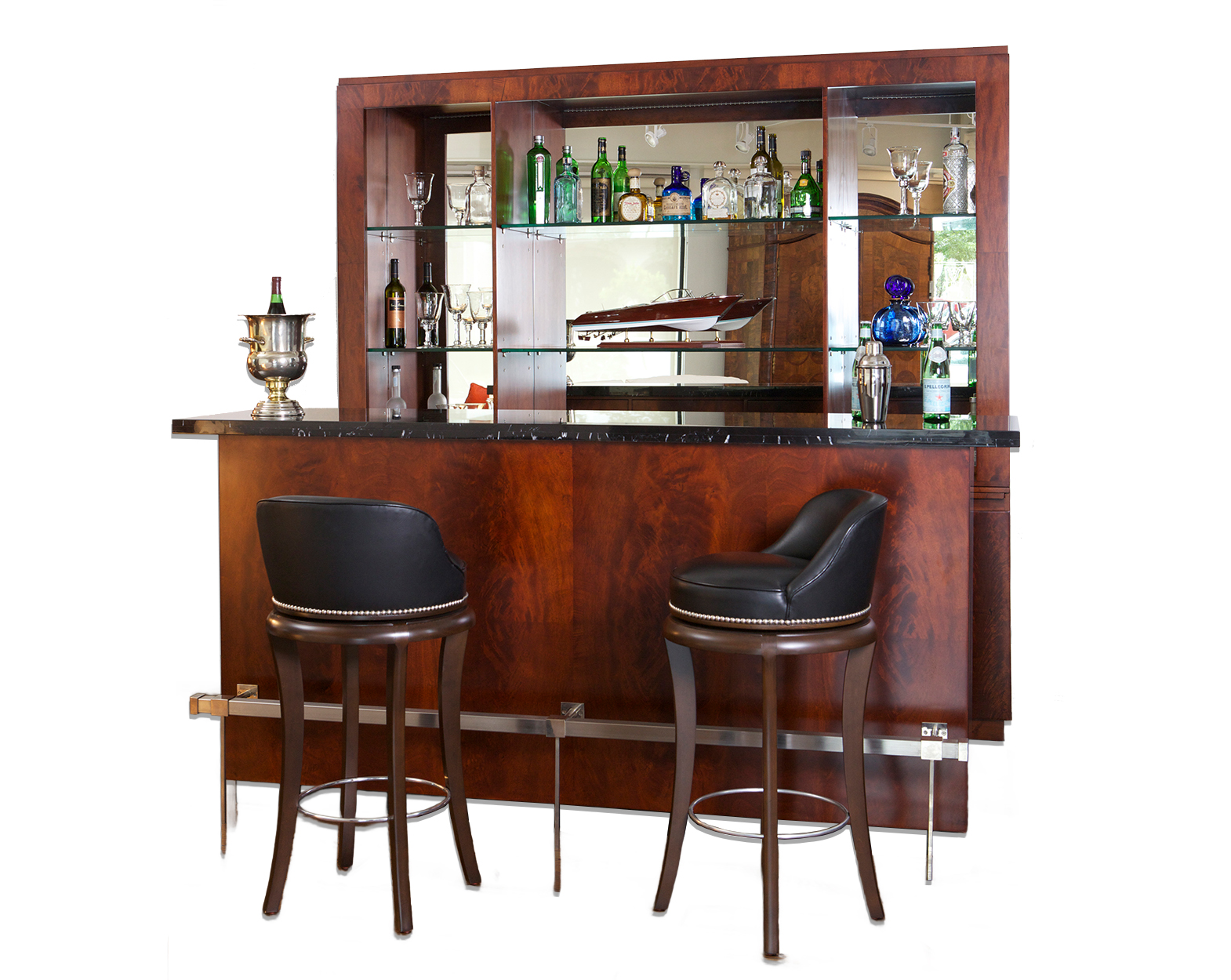 Cantina Contemporánea compuesta por barra y contra, Barra con cajones y entrepaños, cubierta con mármol. Contrabarra con cajones y puertas, parte baja y parte superior con entrepaños de cristal movibles. Luz interior.