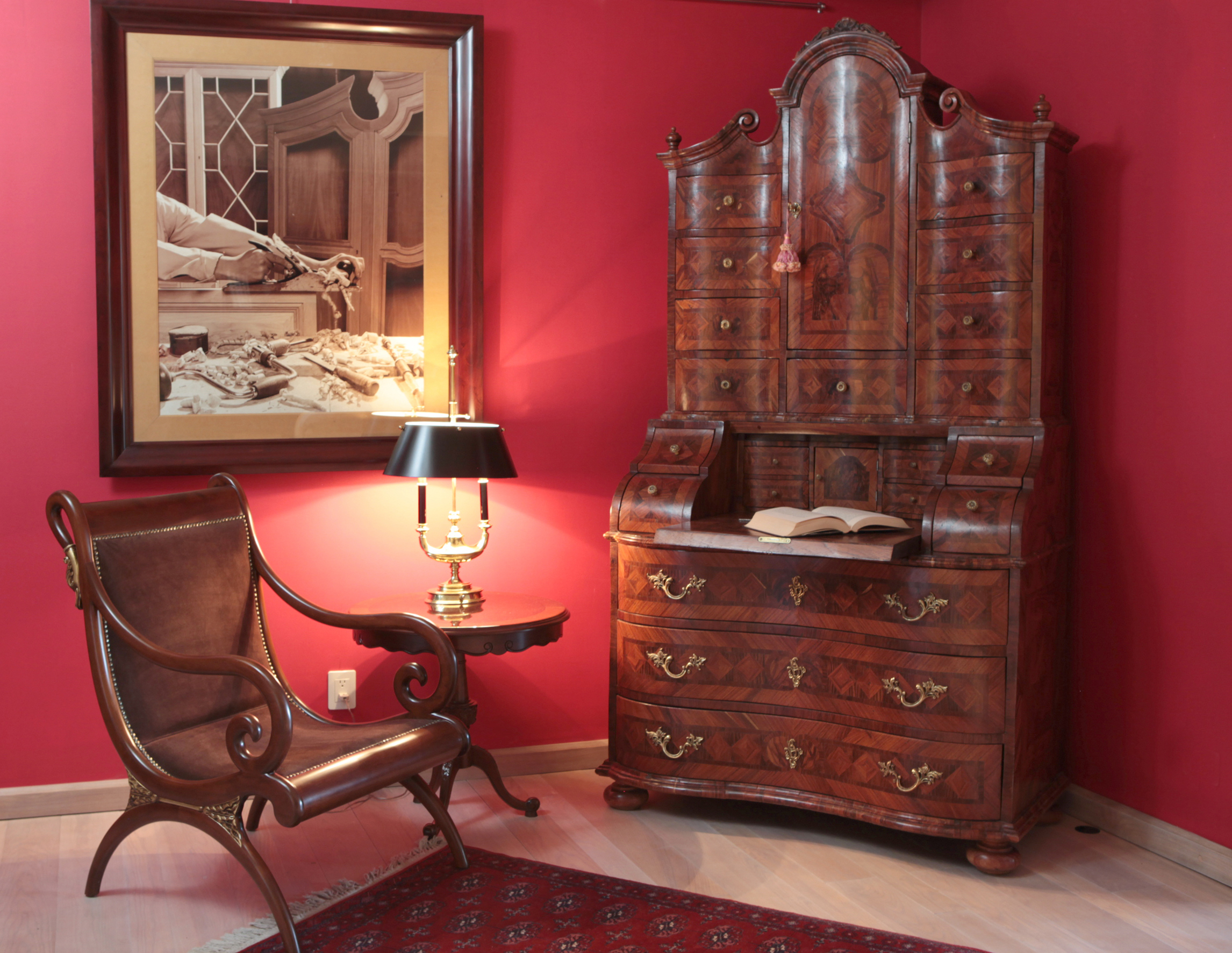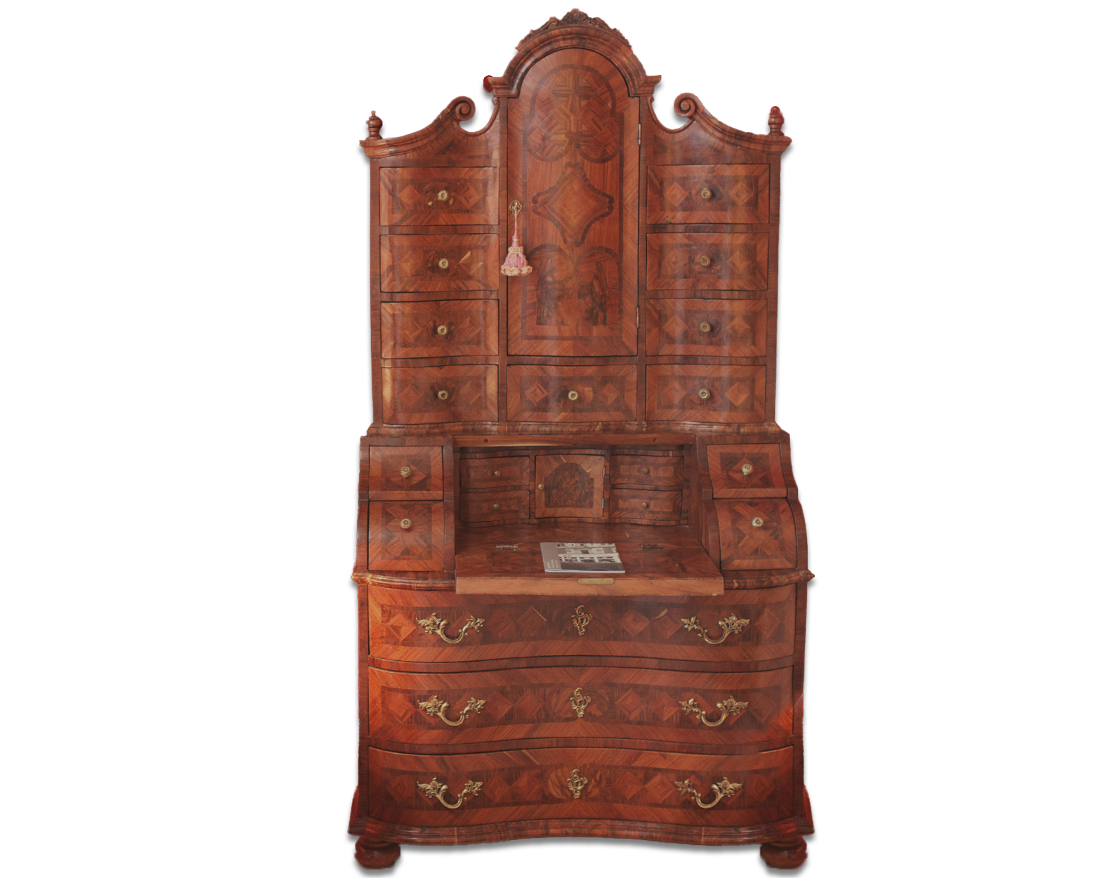 Secretaire , reproducción de una pieza del siglo XVII, fabricada al estilo de la época, con dos puertas en la parte superior, tapa abatible y cajones en la parte inferior, y en el interior de las puertas.gran manejo de las chapas para darle la elegancia y presencia.